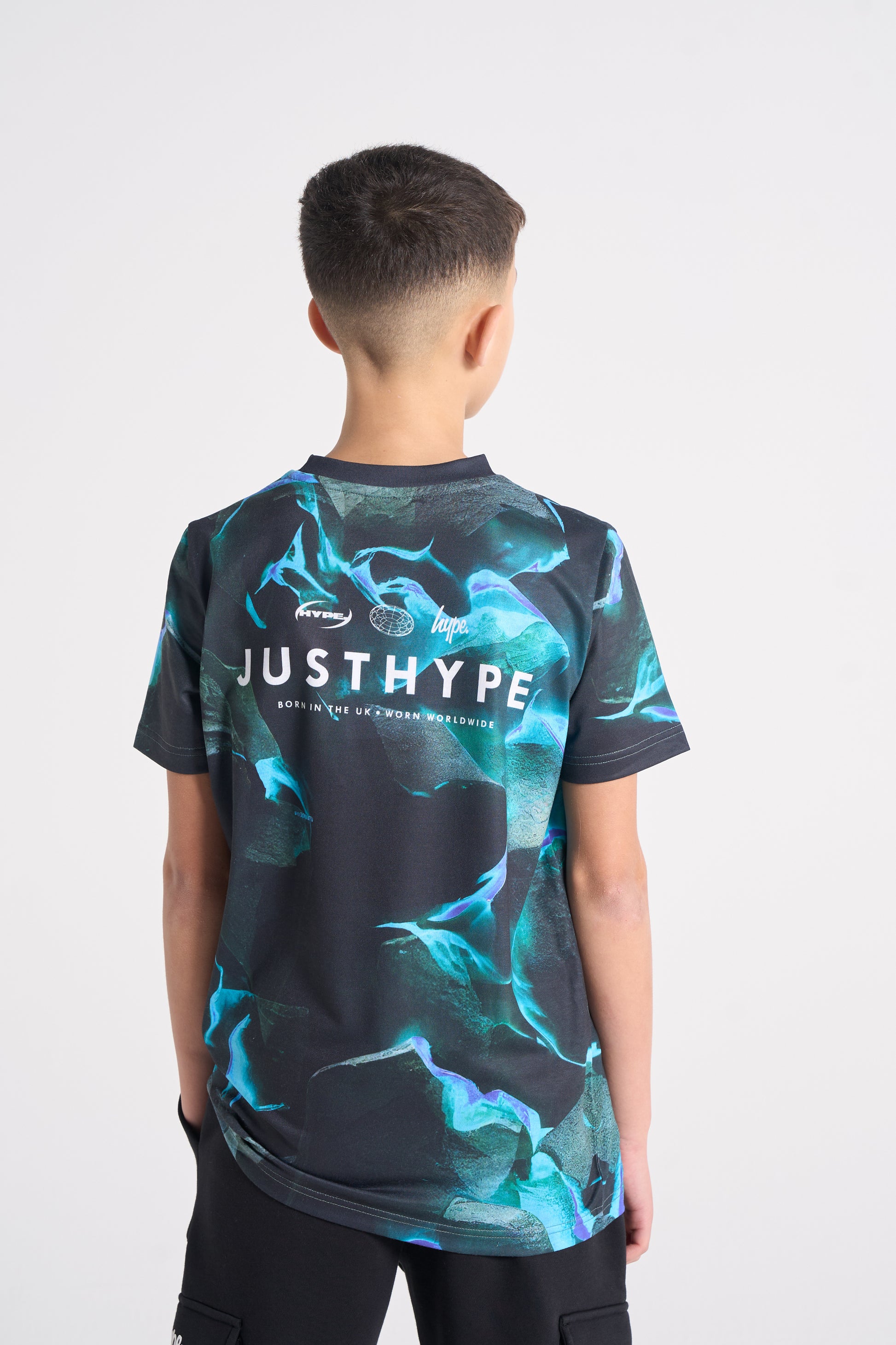Fuel their style with the Hype Boys Black/Blue Vapour T‑Shirt, a standout piece packed with futuristic attitude. Featuring an all‑over black and blue vapour effect, this tee brings swirling electric tones and bold movement to every look. The front keeps things clean with a subtle JustHype chest print, while the back delivers the full impact with a large JUSTHYPE graphic and layered logo details.